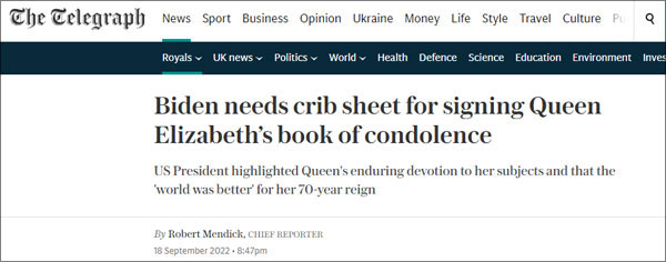 英媒《每日电讯报》显然发现了这一点,在当日报道的标题中尖锐写道“拜登需要小抄才能签署女王的吊唁书”,并以“当他79岁的时候,需要一张小抄是可以被原谅的”作为开头。