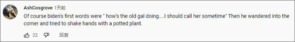 “当然,拜登的第一句话是‘老姑娘过得怎么样……有时间我应该给她打个电话’,然后他走到角落里,试图和一盆盆栽握手。”