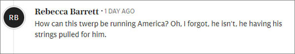 还有人评论,“这个笨蛋怎么能统治美国?哦,我忘了,他只是一个提线木偶”。