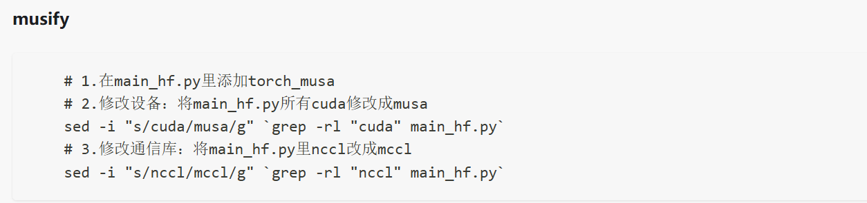 根据官网介绍,对于pytorch代码,只需要正确import torch_musa的拓展插件,并且将代码中的所有cuda->musa,将所有的nccl->mccl即可。