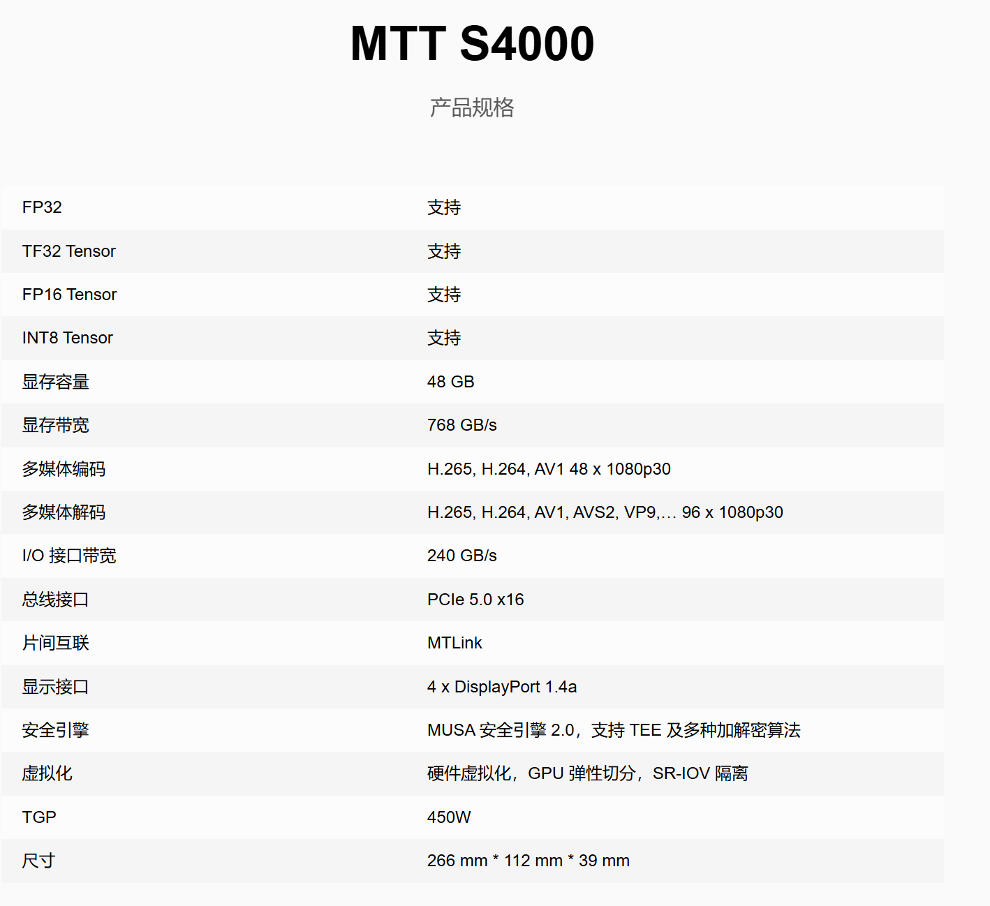 MTT S4000 是基于摩尔线程曲院 GPU 架构打造的全功能元计算卡,为千亿规模大语言模型的训练、微调和推理进行了定制优化,结合先进的图形渲染能力、视频编解码能力和超高清 8K HDR 显示能力,助力人工智能、图形渲染、多媒体、科学计算与物理仿真等复合应用场景的计算加速。
