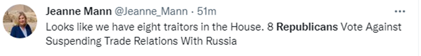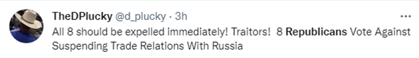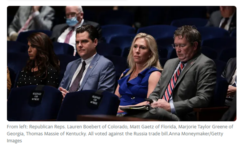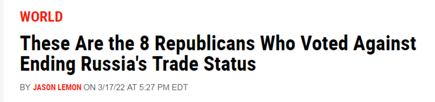 投票结果公开后,在当前美国舆论极度敌视俄罗斯的氛围下,8名投反对票的共和党众议员成了舆论揭批的对象,像美国《新闻周刊》《商业内幕》等直接将报道标题放在“这8个共和党人投票反对终止俄罗斯贸易地位”上,并明确列出这8个人的信息。