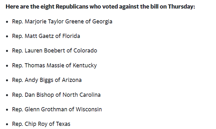 《商业内幕》列出8人的名字,分别是:来自佐治亚州的众议员马乔里•泰勒•格林,佛罗里达州众议员马特•盖茨,科罗拉多众议员劳伦•贝伯特,肯塔基州众议员托马斯•马西,亚利桑那州众议员安迪•比格斯,北卡罗来纳州众议员丹•毕晓普,威斯康星州众议员格伦•格罗斯曼,德克萨斯州共和党众议员奇普•罗伊。