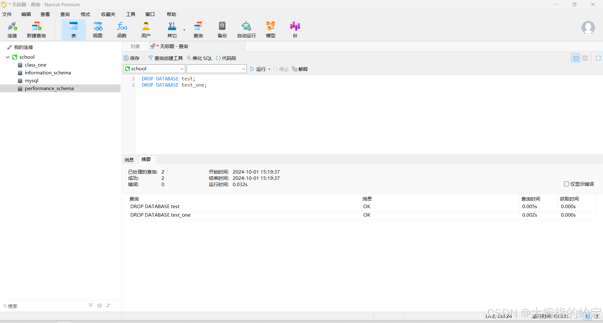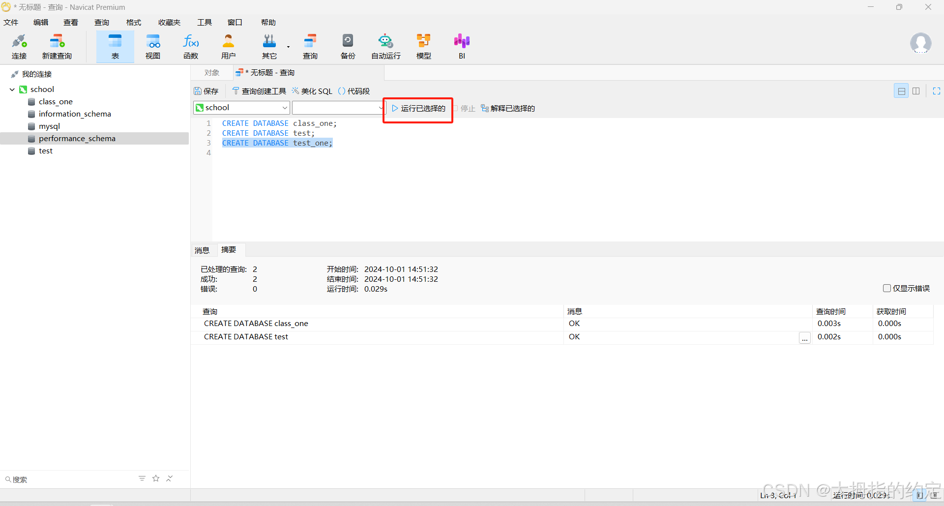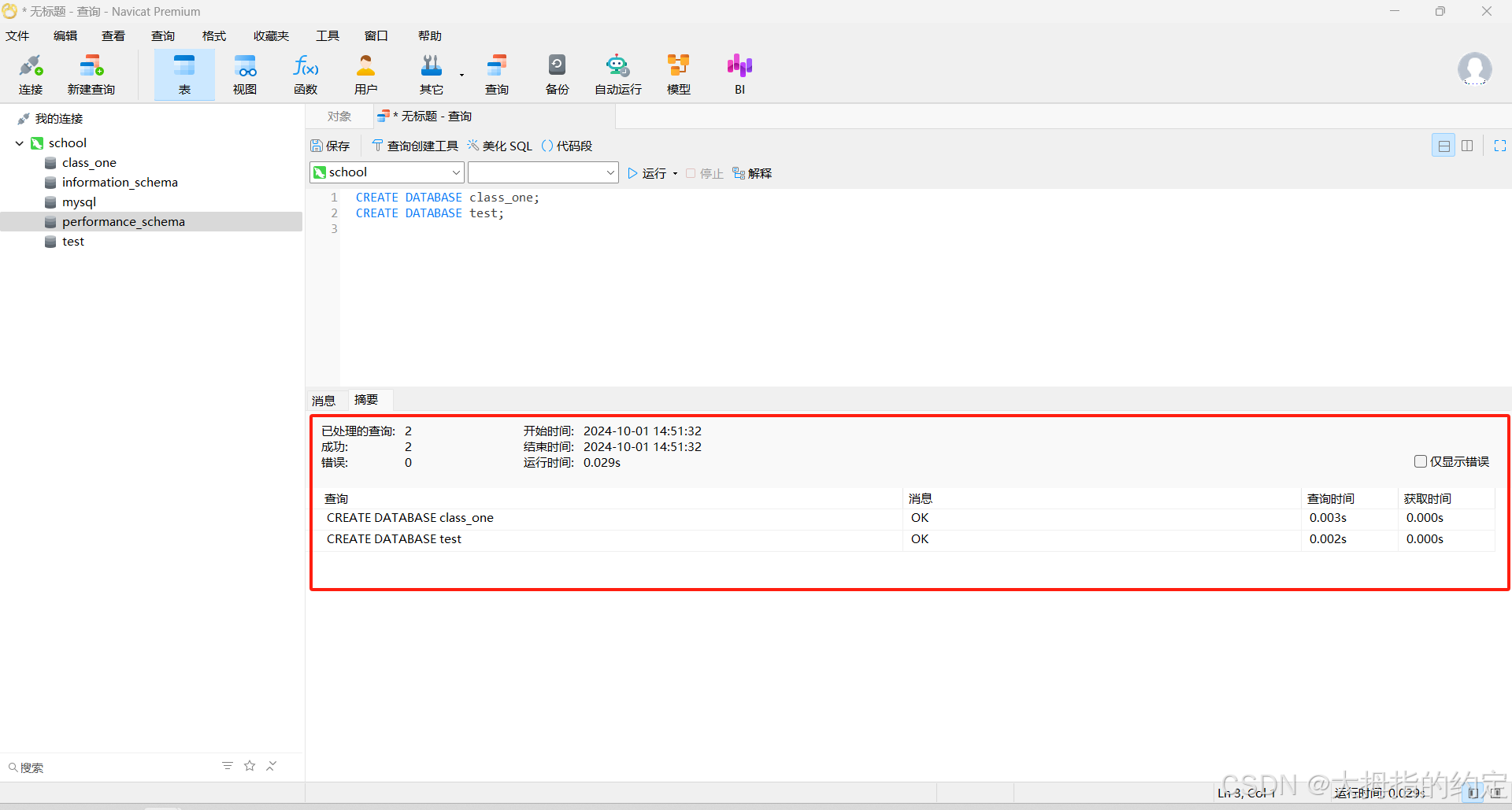 存在多条命令的时候,会按照顺序执行命令,在结果区域会显示已处理的查询,成功,失败。已处理的查询:代表的命令的总数量。成功:代表命令执行成功的数量。失败:代表命令执行失败的数量。