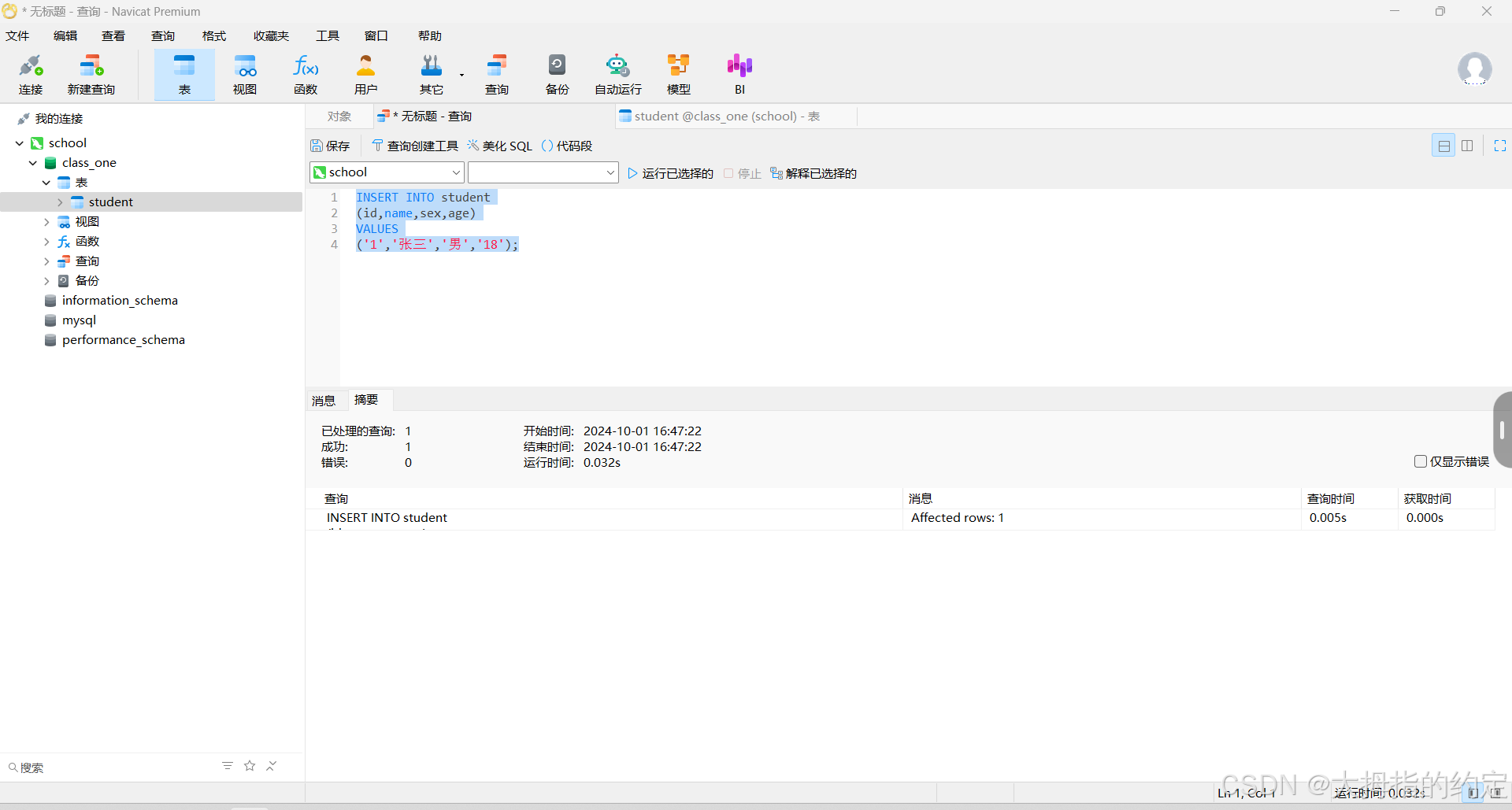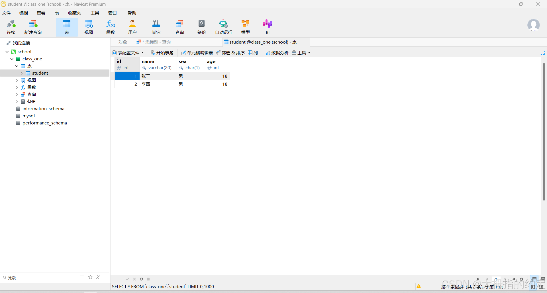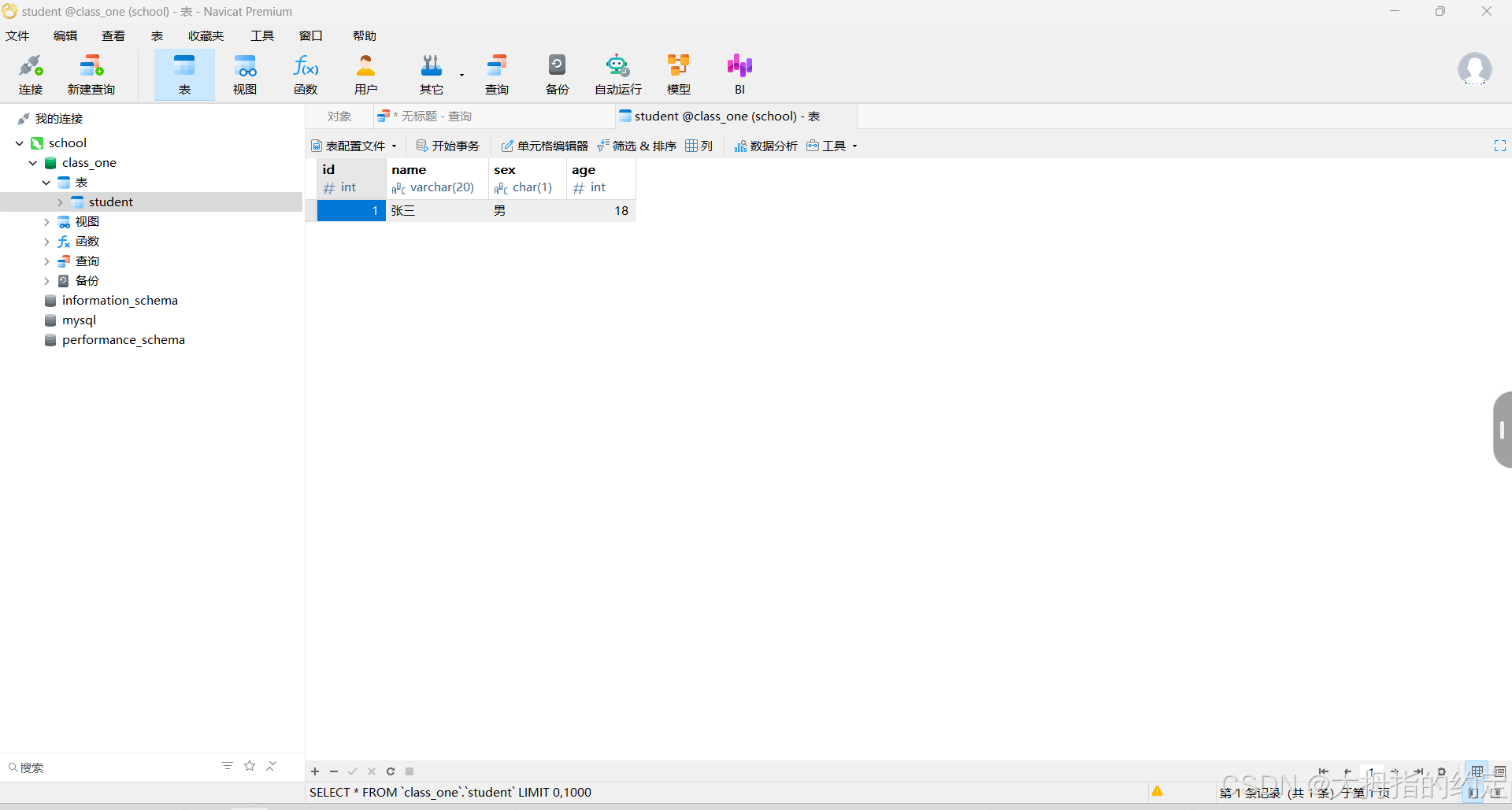 (‘1’,‘张三’,‘男’,‘18’);给数据表插入数据