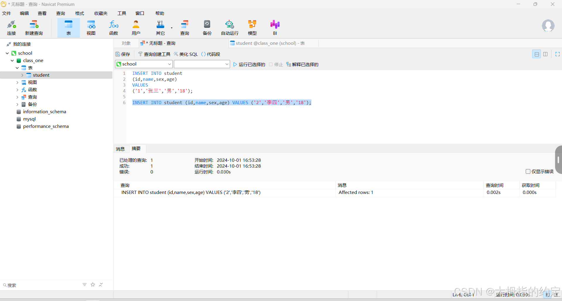 INSERT INTO student (id,name,sex,age) VALUES (‘2’,‘李四’,‘男’,‘18’);