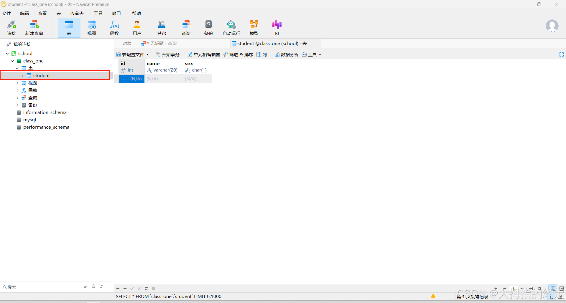 sex char(1));创建有三个字段的数据表。