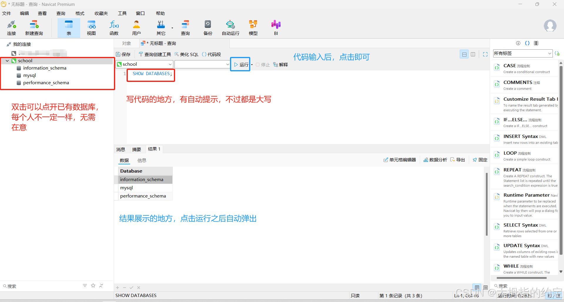 PS: 数据库名,数据表名,字段名都不允许出现任何大写字母。