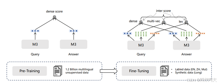 模型训练阶段主要包括预训练和微调,同时采用了大量无监督对比学习,微调阶段引入三种不同的匹配路径(稠密、稀疏和多向量),从而综合考虑了文本的语义(dense)、局部细节(multi-vec)以及词法线索(lex)。