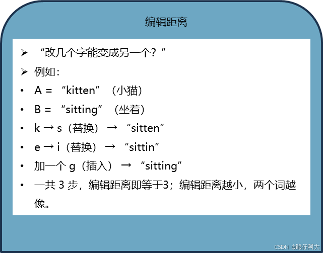 - 编辑距离: 计算将一个字符串转换为另一个字符串所需的最少单字符编辑(插入、删除、替换)次数。距离越小,越相似。
