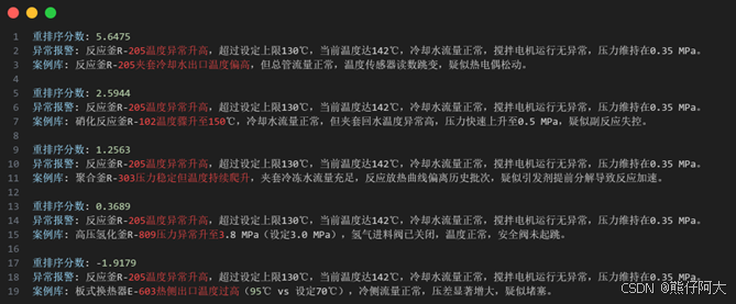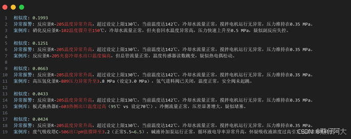 A结果可以明显观察到,其更偏向于每个文本特有词汇,致使排名靠前的案例均为“反应釜”相关案例,第3个案例中温度并未偏高,对于异常报警所反映的“温度异常升高”现象显然存在偏差,但总体基本都属于相似案例;