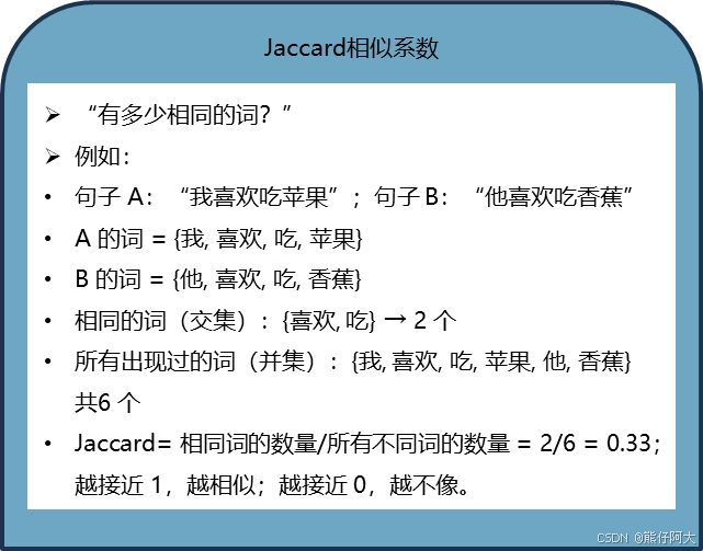 - Jaccard相似系数: 将文本视为词的集合,计算两个集合的交集与并集的比值。