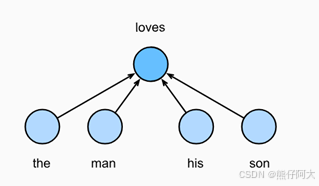 连续词袋模型类似于跳元模型,区别在于,连续词袋模型假设中心词是基于其在文本序列中的周围上下文词生成的,即基于上下文词“the”,“man”,“him”,“son” 生成中心词“loves”的条件概率。