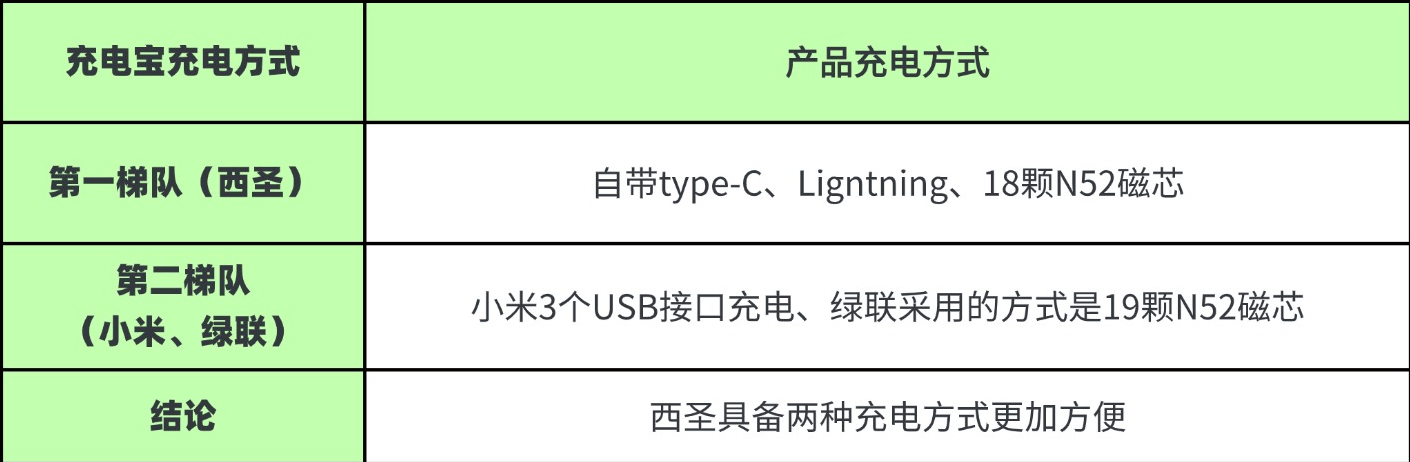 点评:很明显,三款充电宝的充电方式均有所不同,其中西圣PB这款充电宝不仅自带一条type-C口和Ligntning口数据线,可以给不同设备充电之外,在磁吸方面是有18颗N52磁芯,3500GS的吸附能力,实测过程中小编有尝试晃动一下根本不会移位置,非常的稳固!此外,充电宝侧边还配备了一个type-C口就算是想要插数据线充电也是能够支撑的!总得来说西圣PB这款充电宝在充电方式上每一种方式它都有,外出携带出去非常的方便的!