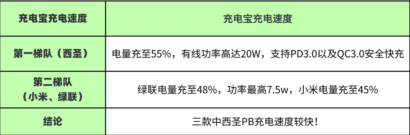 点评:在规定的一个时间内,3款充电宝的一个充电速度均是不同的,经过实测体验得知,西圣在充电方面相当迅速!仅 30 分钟,就能将手机电量充至 55%!这款充电宝之所以充电如此之快,在于机身支持 PD3.0 和 QC3.0 安全快充,并且有线数据线具备 20W 的充电速度,其充电速度是市面上部分共享充电宝的 2 倍。对于绝大多数用户而言,已足以满足一天甚至更长时间的正常使用需求。即便充电速度快,也无需担忧充电宝发热的问题,因为机身配备了 Air-DDVT 双风道涡流散热系统,不仅充电快,散热系统也非常的优秀!