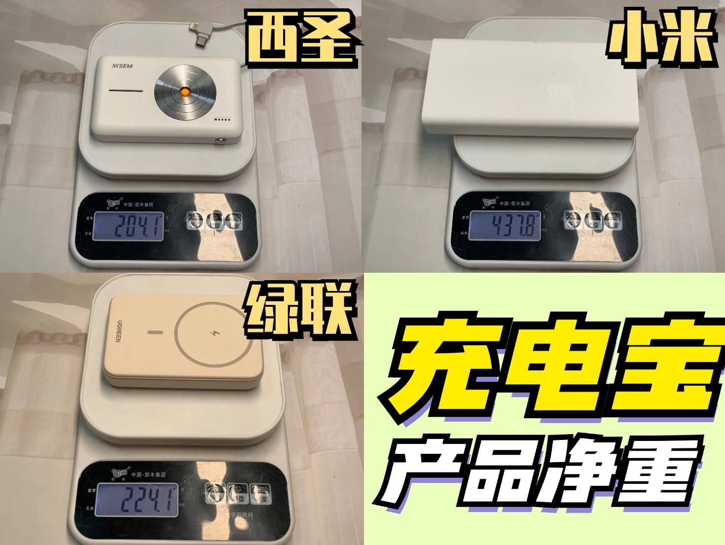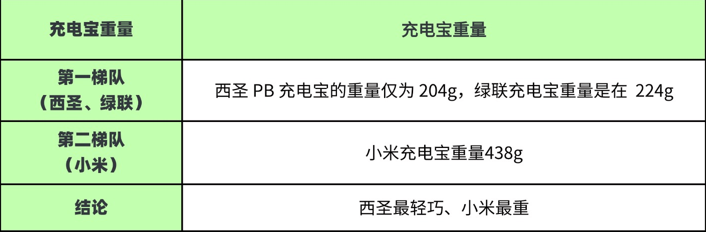 绿联这款充电宝的一个重量是在 224g,外观大小不会很大,携带上也是比较方便的。而小米这款充电宝在重量方面的话是438g的,外观体型也是比较大的,三款充电宝中这款是比较重的!