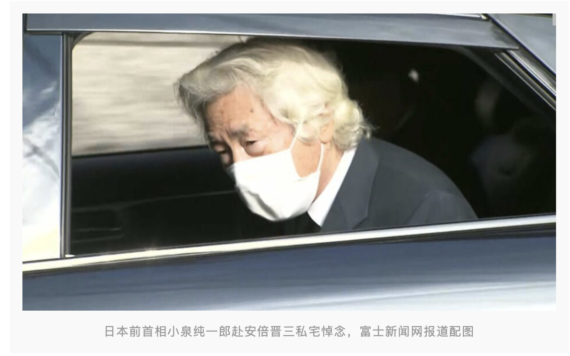 日本富士新闻网9日消息,日本前首相小泉纯一郎于当地时间当天下午4时30分许抵达安倍晋三私宅,对8日因遭受枪击而身亡的安倍晋三表示悼念。报道还称,晚些时候,日本前首相森喜朗也来到安倍私宅对死者表示悼念。