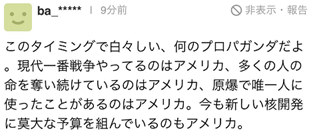 有人批评说,“在这个时机(这么做)脸皮真厚,这是什么鬼政治宣传。在现代打仗最多的是美国、夺走大量人生命的是美国、唯一对人使用过原子弹的是美国、现在在核扩张上投入巨大预算的也是美国。”↓
