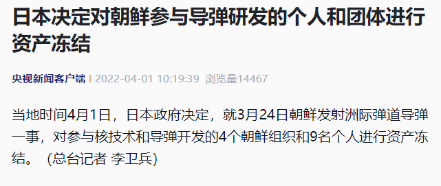 当地时间4月1日,日本政府决定,就3月24日朝鲜发射洲际弹道导弹一事,对参与核技术和导弹开发的4个朝鲜组织和9名个人进行资产冻结。