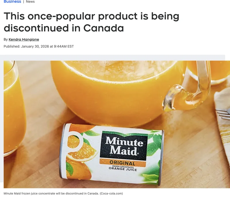 可口可乐公司已向 CTVNews.ca 证实,美汁源(Minute Maid)冷冻果汁浓缩罐将在加拿大和美国停止销售。
