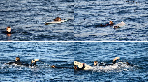 有时候,人类发起进攻试图抢回冲浪板,海獭还会很生气地咬冲浪板,此时更像是在挑衅:再抢,我咬烂它!