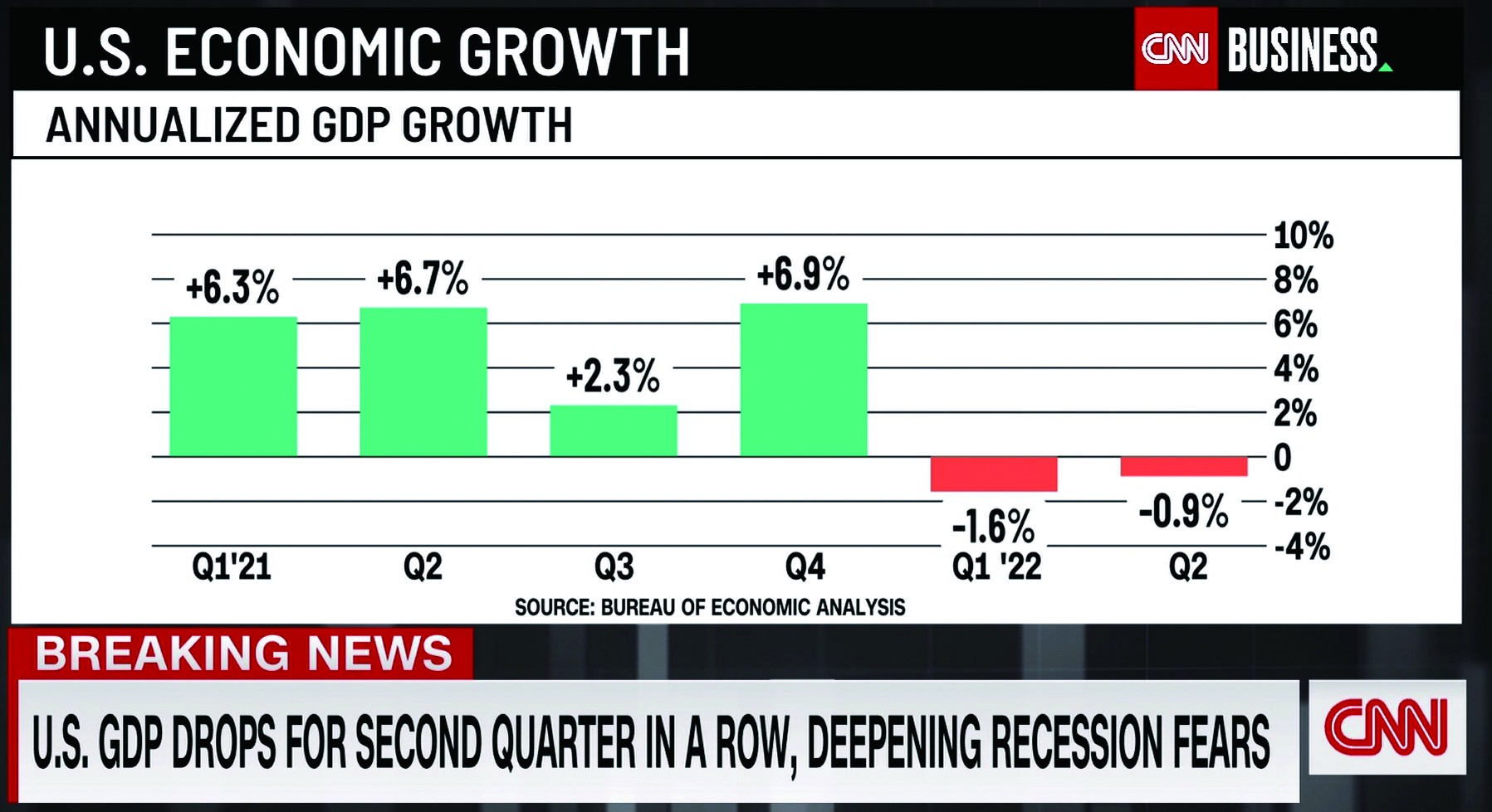 [环球时报驻美国特约记者 英辰 环球时报记者 倪浩 任重 柳玉鹏]美国经济是否宣告走向衰退?美国商务部28日公布的数据显示,今年第二季度美国国内生产总值(GDP)年化环比下降0.9%,此前第一季度GDP年化环比收缩1.6%。国际货币基金组织(IMF)称,以连续两个季度出现负增长的指标,美国经济已处于“技术性衰退”。但美国总统拜登随即发表声明称,当下的美国经济“不像是一次衰退”,甚至“还有进步现象”。有关“衰退”的争论令人眼花缭乱,但正如《纽约时报》所说,拜登和他的助手们花了这么多时间来否认“衰退”,本身就表明美国人对经济已经变得多么悲观,以及政府为什么很难改变他们的想法。“衰退这个词充满了政治意义”,美国“市场节奏”网站29日称,可以肯定的是,共和党人和民主党人会给出两个不同的答案,“不受欢迎的拜登总统无法承受美国人打开电视机并听到自己国家正处于‘衰退’中的新闻,尤其是在中期选举之前”。