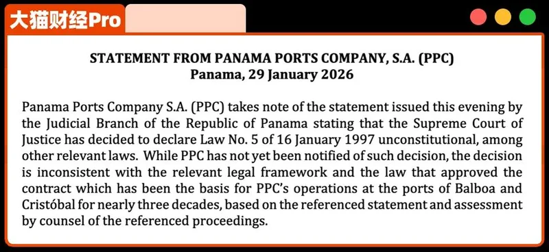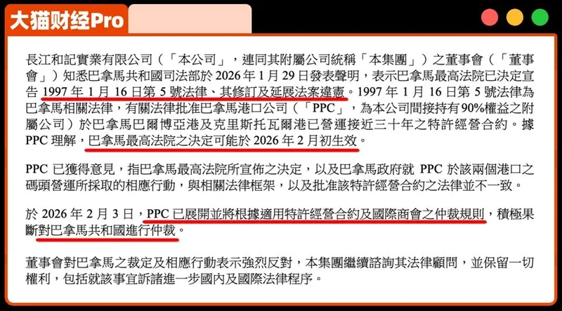 长和2月4日盘前发布公告,知悉巴拿马于1月29日发布声明,对1997年1月16日经有关法律批准获准巴拿马港口公司(公司简介持有90%权益的公司PPC),在巴拿马巴尔博亚港和克里斯托瓦尔港已经营接近30年的特许经营合约违宪。巴拿马最高法院的裁定可能于2026年2月初生效。