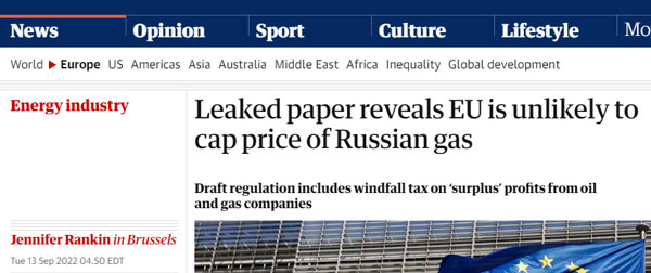 综合《卫报》、路透社报道,其获取的一份名为“电力应急工具”的法规草案显示,在应对当下欧洲能源危机的解决方案中,由于成员国上周未达成一致,草案内容既不包含对俄罗斯天然气设定价格上限,也不包含对其他进口天然气设定价格上限。