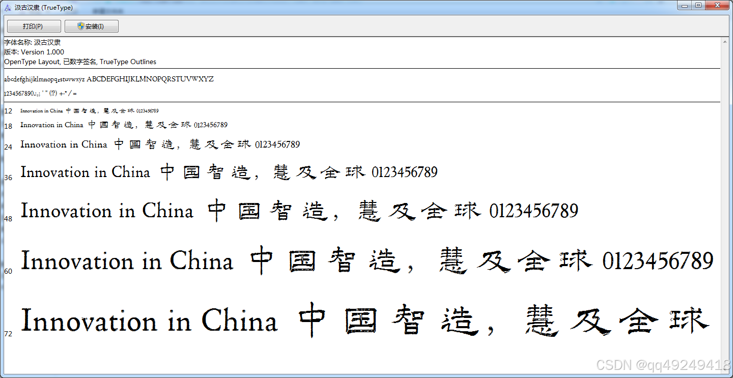 首先看一下汲古汉隶字体下载后,打开字体文件预览一下: