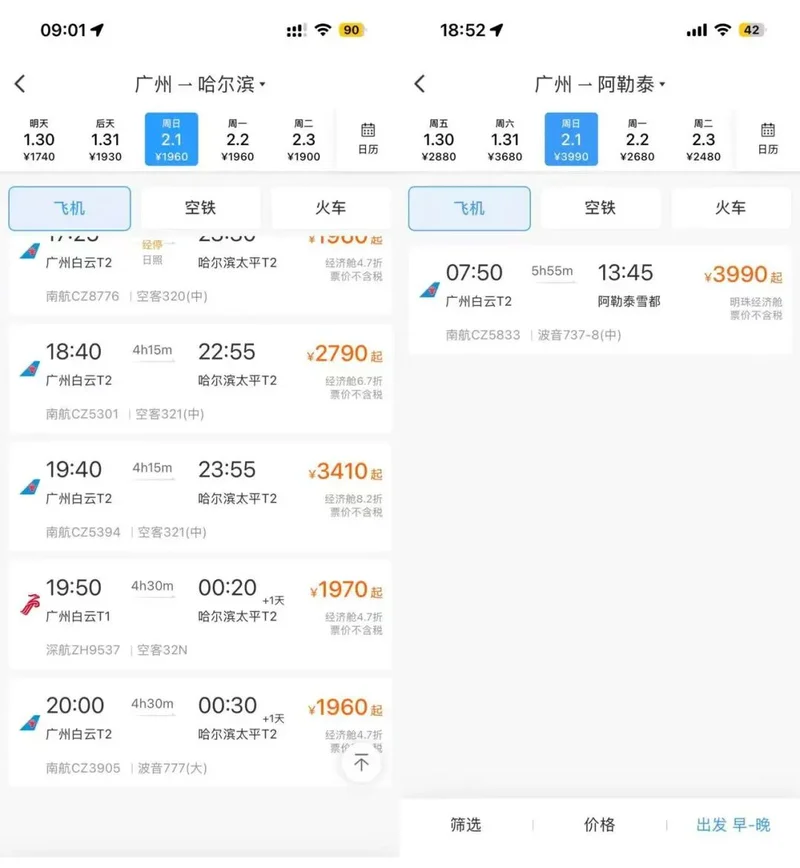 不过,考虑到交通问题,东北显然是更合适的选择。从中国的主要南方城市,例如广州、深圳、长沙、杭州等地出发,可以发现哈尔滨太平国际机场有大量直飞航班。同一天搜索去新疆阿勒泰的航班,武汉一架飞机都没有,广州仅有一趟;机票价格上,去新疆的单程机票直逼4000,比去哈尔滨最便宜的机票贵了两倍多[33][34][35][36]。