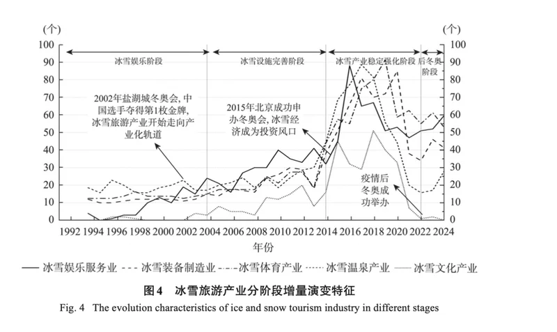 伴随着北京奥运会的筹办,这一局面随之被打破。2015-2024年间,全国范围内逐渐建成 654 座标准冰场与 803 处室内外滑雪设施,相较于 2015 年,增长率分别达到 317% 和 41%[47]。哈尔滨的冰雪旅游产业数量,从300家出头涨到800多,长春、吉林、沈阳的相关数据则翻了四五倍[47]。