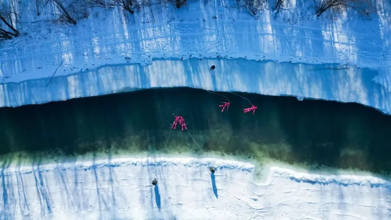 图为“冰浮”活动照片,穿好防护服、绑好牵引绳的游客仰躺在天然河流中,两岸是皑皑白雪 / 图源小红书用户@筏喻极地森林生态冰浮,已授权