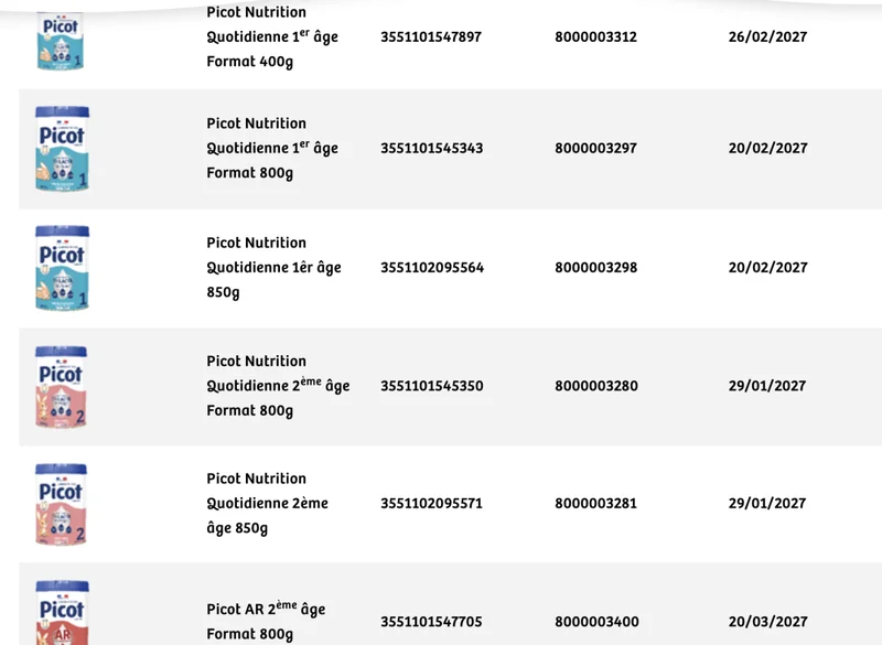 不同品牌的召回截止日期不同。雀巢旗下的产品截止日期为3月5日,Picot奶粉为3月21日,Gallia和Blédilait为3月23日,Babybio为3月25日。