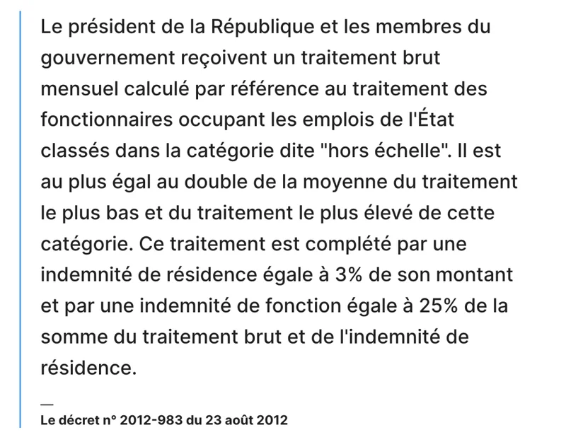 法国总统的收入由法律明确规定,主要来自一项2012年颁布的政令。政令规定: