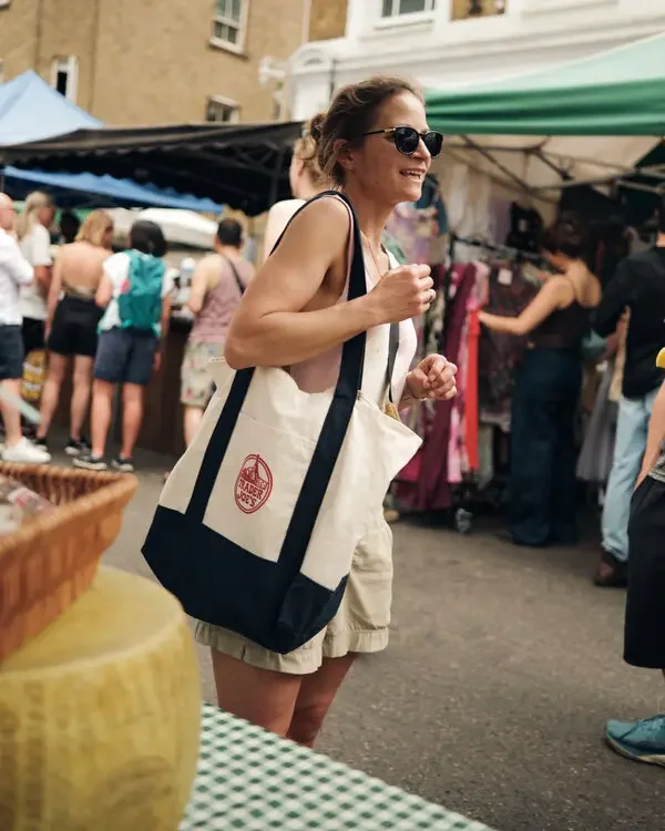 Trader Joe's是装修带着热带风情、店员穿着夏威夷衬衫、拥有各种神奇零食的宝藏超市。但在欧洲,它是一个完全不存在的符号。正因为这份“触不可及”,让那枚印有复古字体的帆布袋有了异域色彩吸引力。