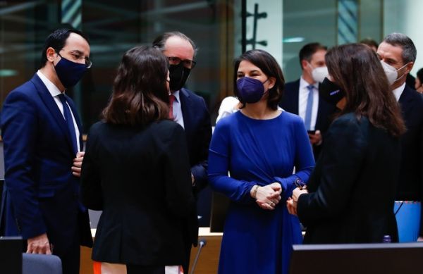 2021年12月13日,在比利时布鲁塞尔,德国外交部长贝尔伯克(前右二)出席欧盟外长会。(新华社发)