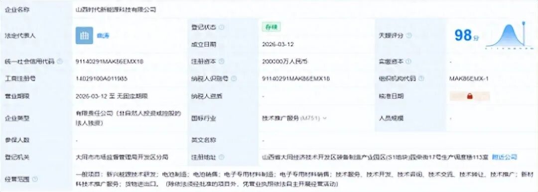 3月13日,由动力电池龙头企业宁德时代全资持股的山西时代新能源科技有限公司正式成立,注册资本达20亿人民币。