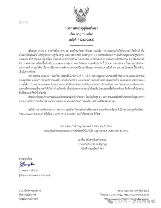 受台风“麦德姆(Matmo)”外围气流与西南季风共同影响,10月5日至7日期间,泰国北部、东北部及南部沿海地区将有中到大雨,部分地区可能出现山洪、森林径流与河岸溢流。