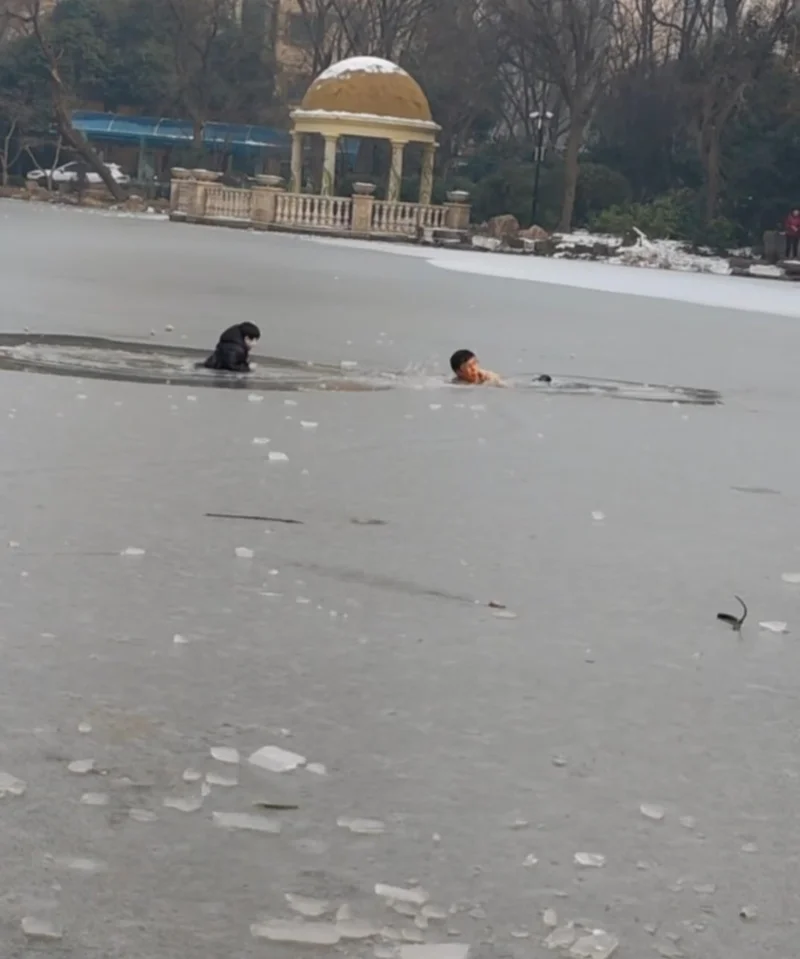 近日,一条孩童在结冰湖面玩耍不慎落水,被一男子匍匐救起的视频引发关注。视频中,小孩落水后,男子匍匐在冰面上向小孩靠近,后来冰面破裂,该男子也落入水中。随后,男子将小孩快速捞到冰面上。小孩被顺利救出后,男子多次尝试上岸未果。最后,一名穿黑色棉服的男士趴着将该男子拉上岸。
