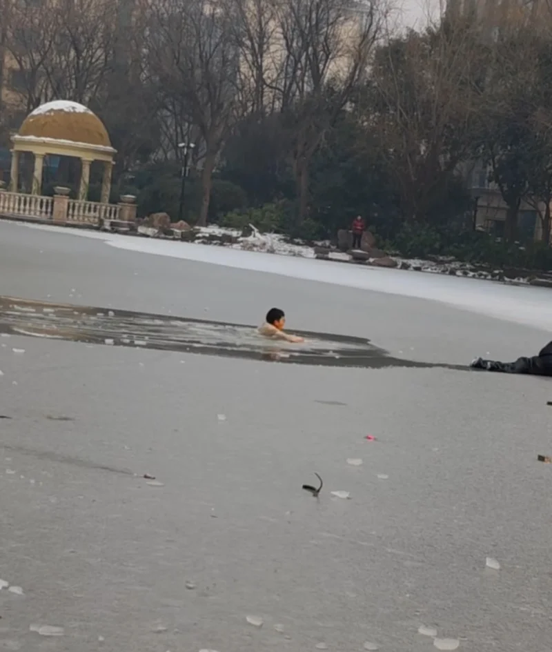 据班先生回忆,1月24日上午10点左右,他正带着孩子在小区玩耍。走到湖边时,看到有小朋友在结冰的湖面玩耍,其中有一名小男孩不顾家长劝阻,朝冰面较薄的湖中心走去。班先生称,孩子个子大概1.2米左右,而湖中心的深度大概在1.4米,他一旦掉进去是无法站立的,十分危险。