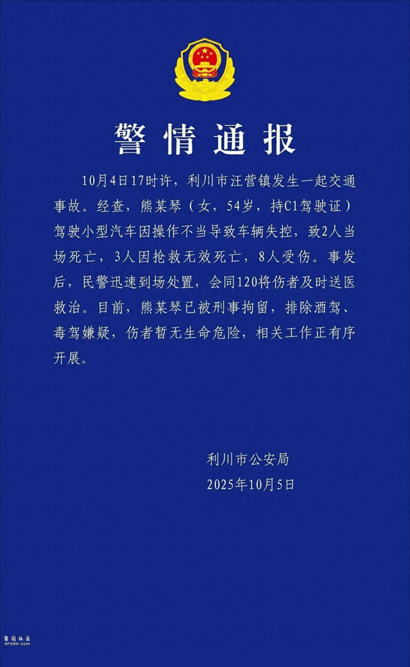 当地警方称,54岁女子熊某琴驾驶小型汽车因操作不当导致车辆失控,致2人当场死亡,3人因抢救无效死亡,8人受伤。