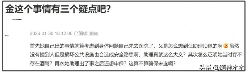 金晨的风波一共就涉及三件事,肇事逃逸、顶包、骗保。而金晨的回应全文都没有提及这三个关键词,反倒一直在辩解,网友纷纷开始质疑。