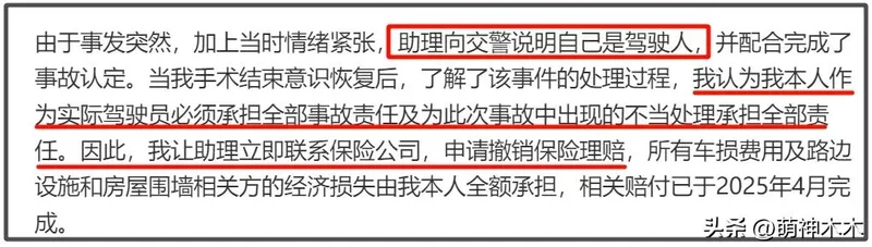 那为什么没有主动纠正这一错误?是否默认助理顶包?嘴上说着自己是实际驾驶者,“必须承担全部事故责任“,实际也只是赔钱了。