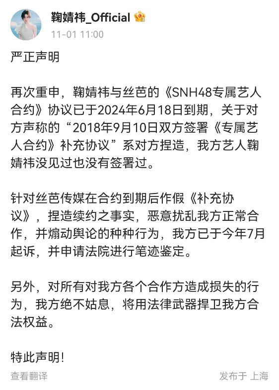 对此,鞠婧祎方也发布声明回应:鞠婧祎与丝芭的《SNH48专属艺人合约》协议已于2024年6月18日到期,所谓“补充协议”系对方捏造,鞠婧祎没见过也没有签署过,并已在7月起诉,申请法院进行笔迹鉴定。对于对合作方造成损失的行为,将用法律武器捍卫合法权益。
