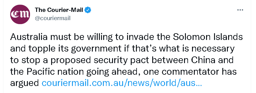 “如果必须的话,澳大利亚应该入侵并占领瓜达康纳尔岛(即所罗门群岛首都霍尼亚拉所在的该国主岛),然后颠覆霍尼亚拉的政权”,他说。