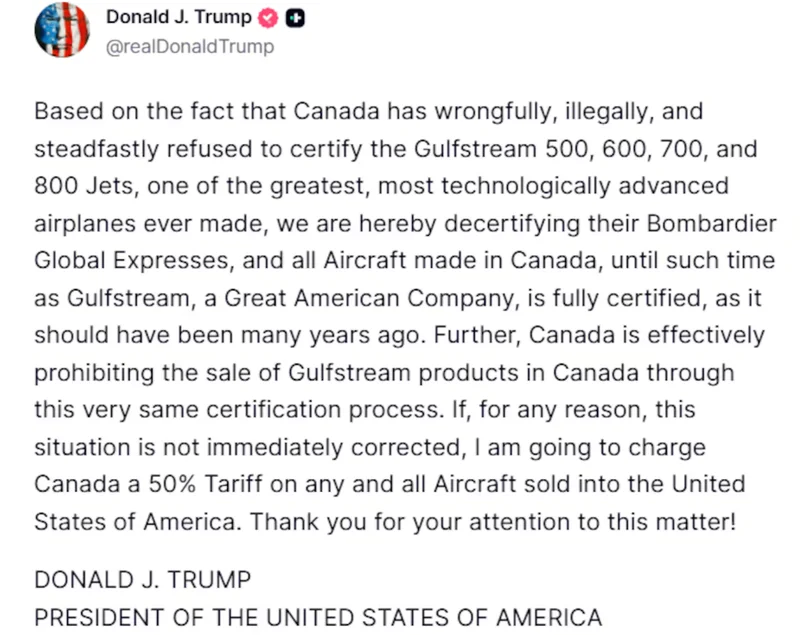 特朗普在Truth Social发文称,在问题解决前,美国将取消对庞巴迪(Bombardier)Global Express以及“所有加拿大制造飞机”的适航认证。