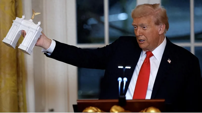 2025年10月15日,特朗普在白宫发表讲话时手持一个拱门模型。图源:美媒
