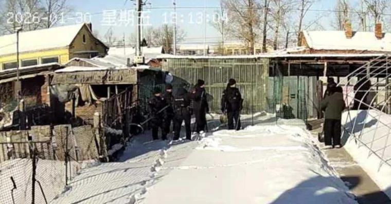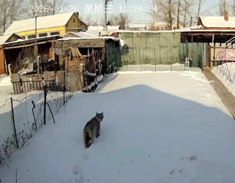 上述监控视频显示,1月28日上午11点24分,一只形似猫的动物在农家院里的雪中前行,踩出深深的足迹。11点50分,这只动物迅速冲向一只猫,双方展开一场激烈的厮杀,猫咪发出惨叫声,渐渐失去了动静。后来猫被拖到了一处角落,消失在监控范围。13:38分,画面里出现了两个人在查看情况。
