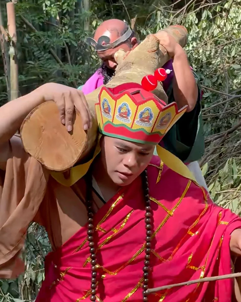 开到山腰,拉“白龙马”的卡车上不去,就得停下了,靠人力行走到山顶。师徒四人只好原地换上行头,牵下白龙。“唐僧”陈淼披上一件新的袈裟,红色斜袍上的金边脱线,显得潦草,像被他用大红色毗卢帽盖住的碎发。
