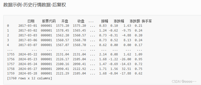 如果以股票代码为“000001”,获取日期从2017年3月1日至2024年5月28日的数据,可以得到如下结果: